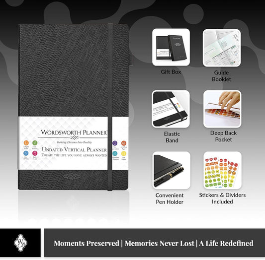 Wordsworth Undated Vertical Planner 2022-2023 - Weekly Planning, Organizer Notebook; Increase Productivity, Time Management - Gratitude Journal; Hit Your Goals - Thick Paper (120GSM) B5, Black